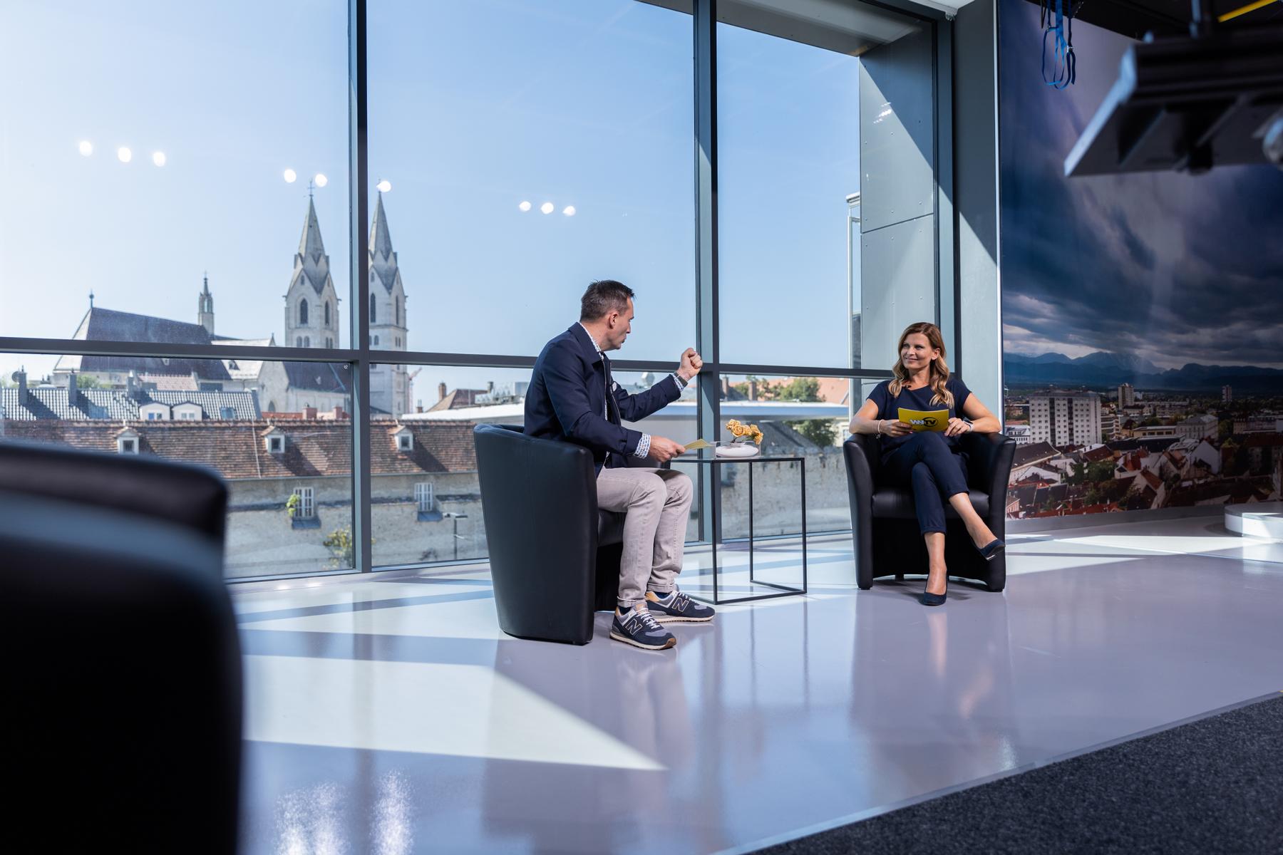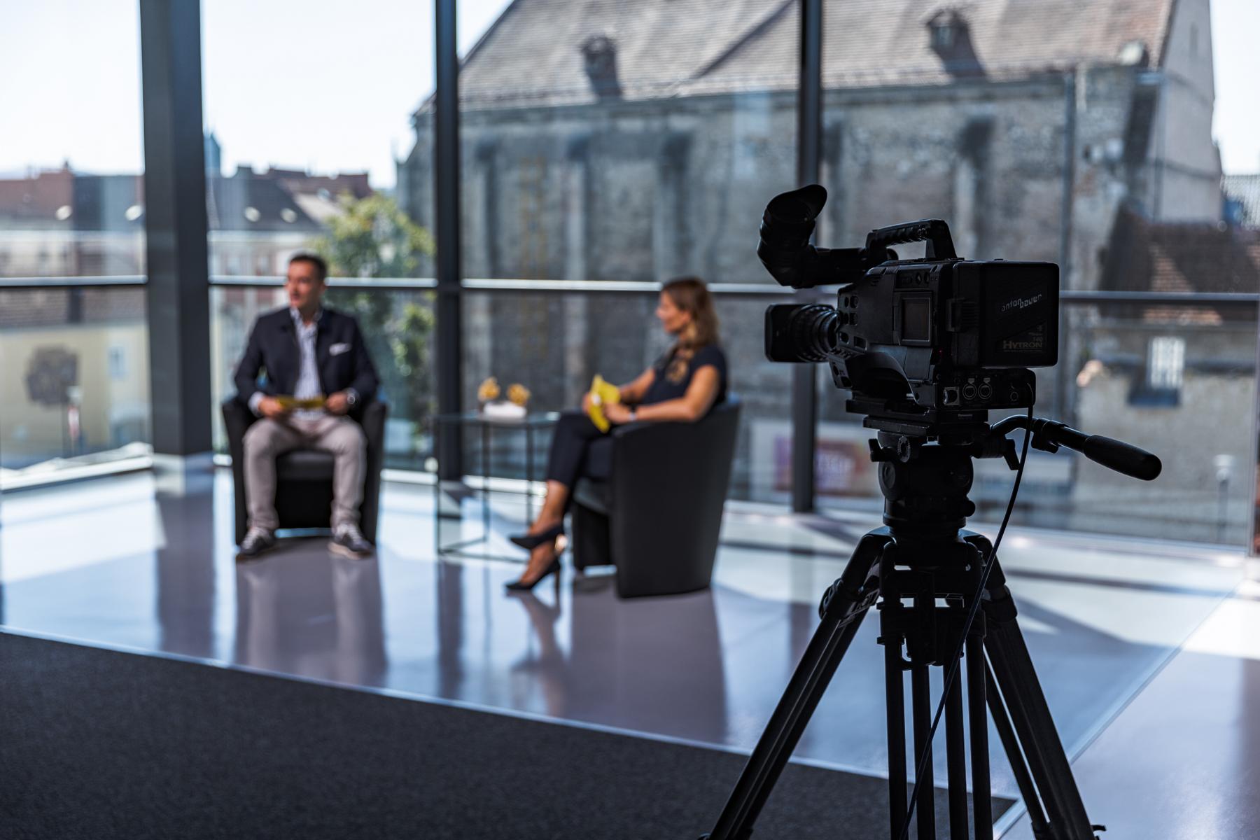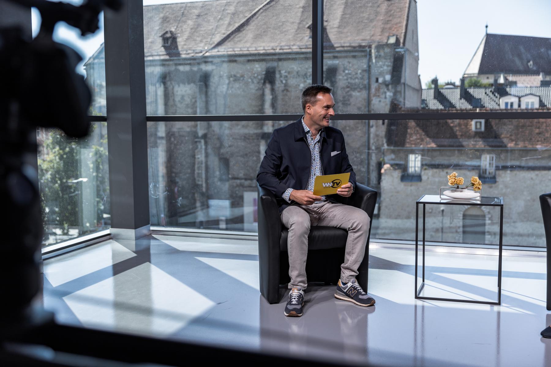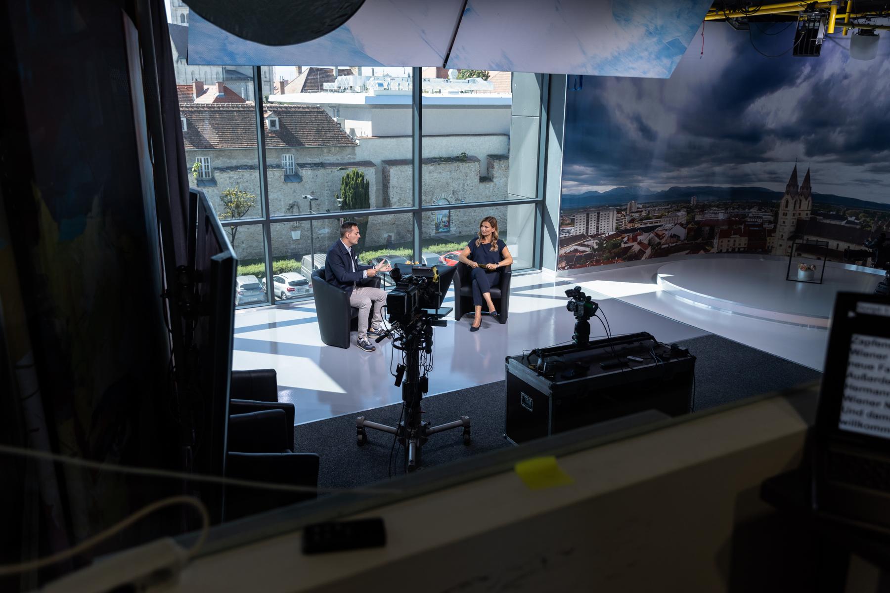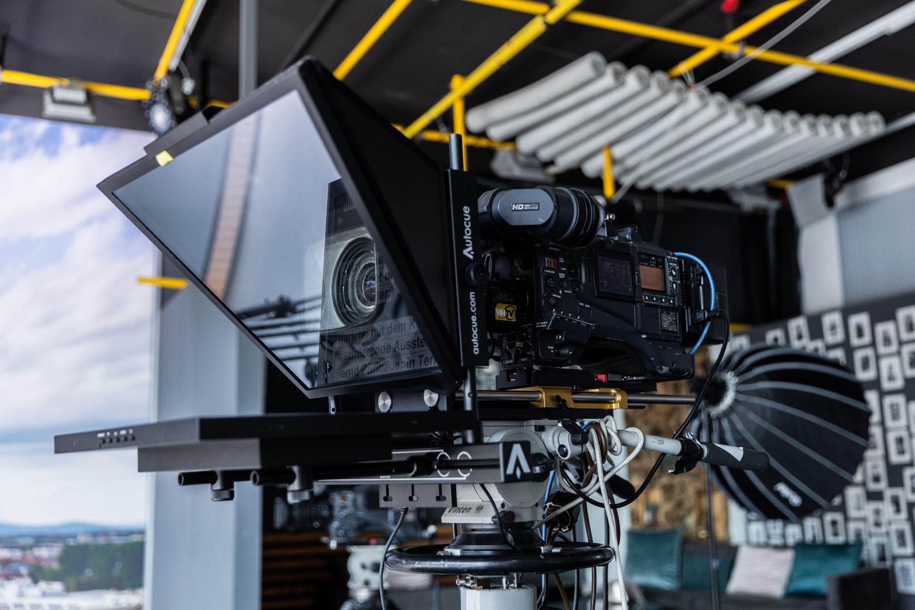 Hinter einer 6 x 4 Meter großen Glasfront bietet die teils 800 Jahre alte Wiener Neustädter Innenstadt die perfekte Kulisse für WNTV. Modernste LED – Scheinwerfer erzeugen im Studio die gleiche Leuchtkraft wie die Sonne an einem Sommertag (500.000 Lumen). Damit wird perfekt das Gegenlicht „ausgeschaltet“.