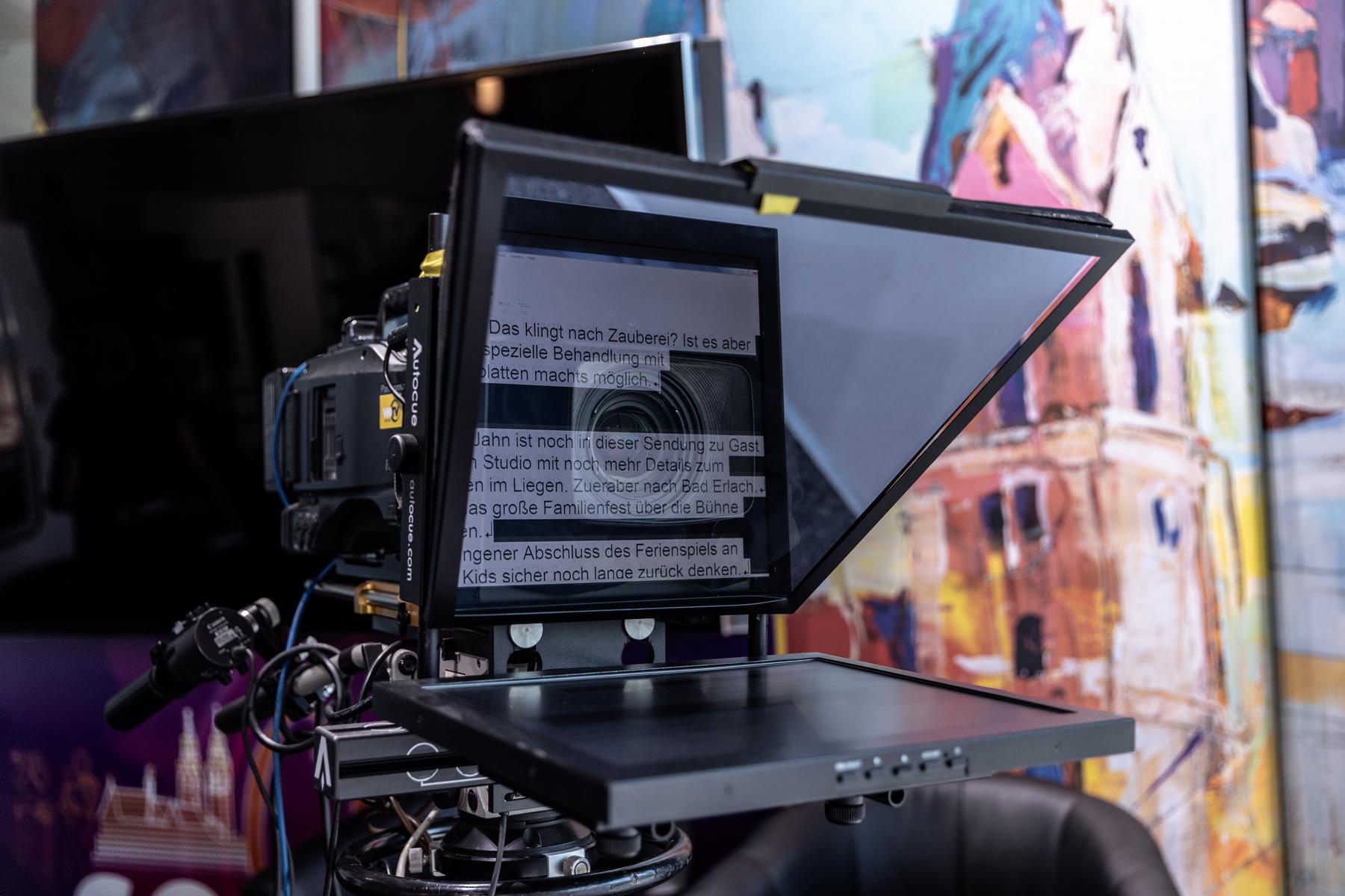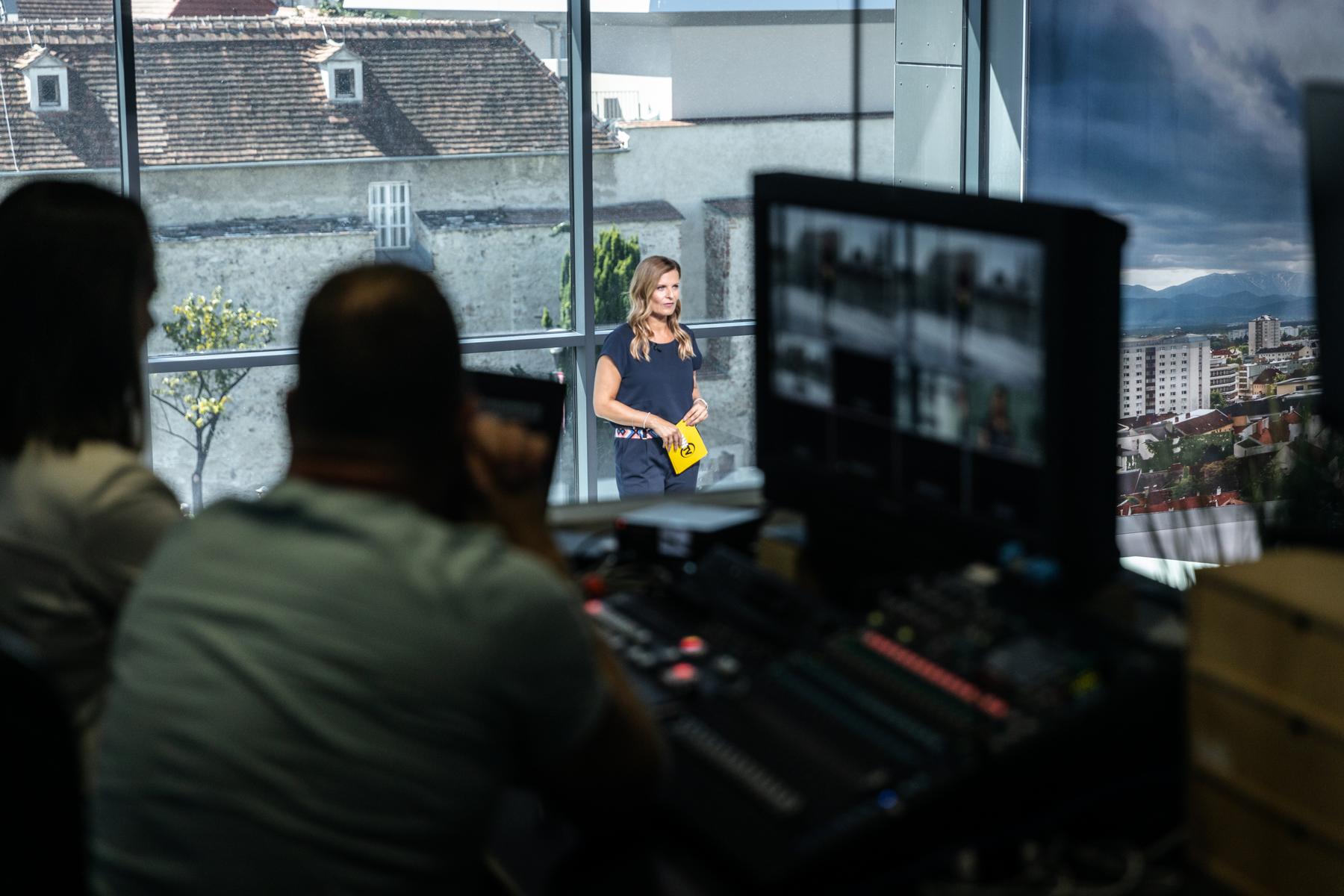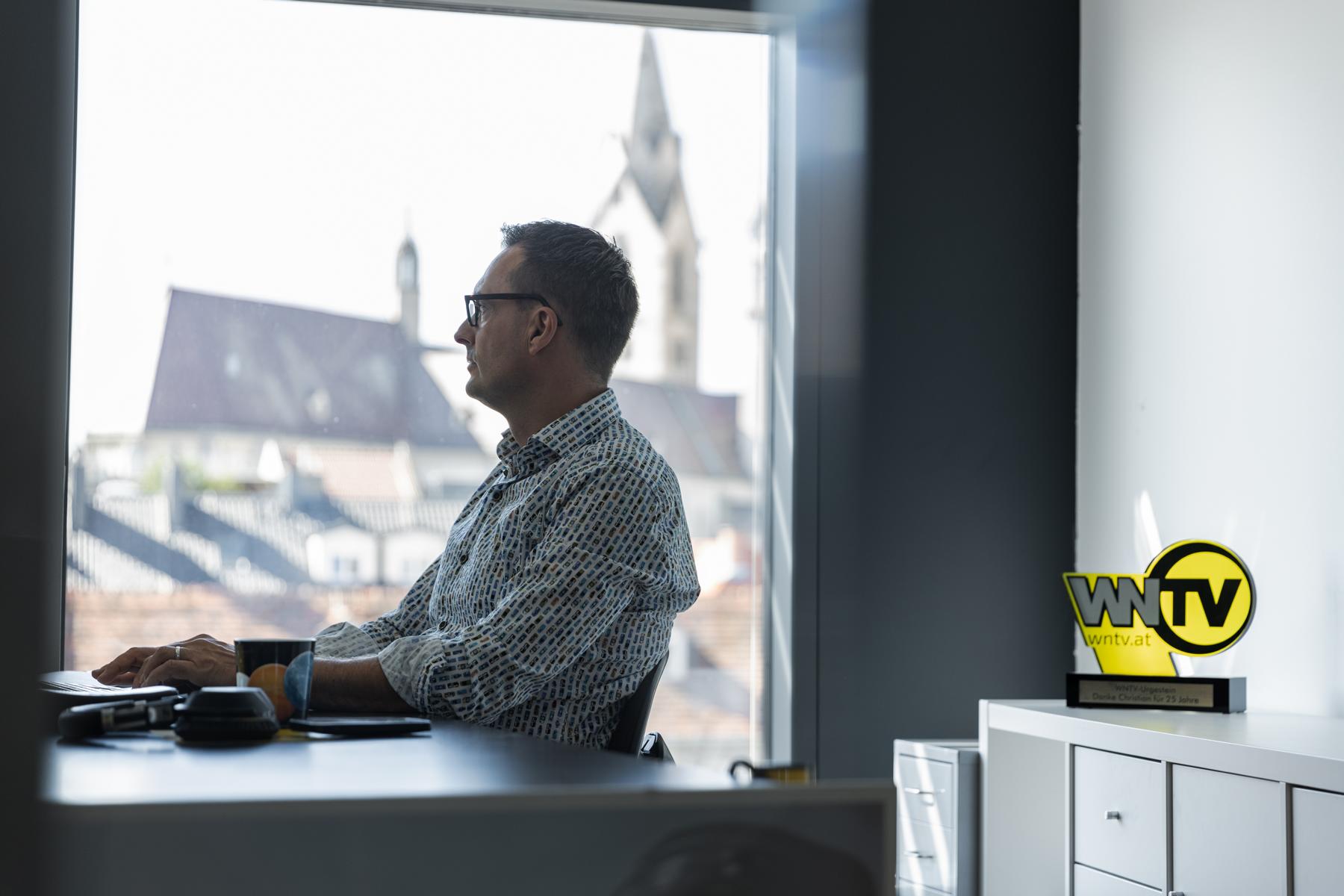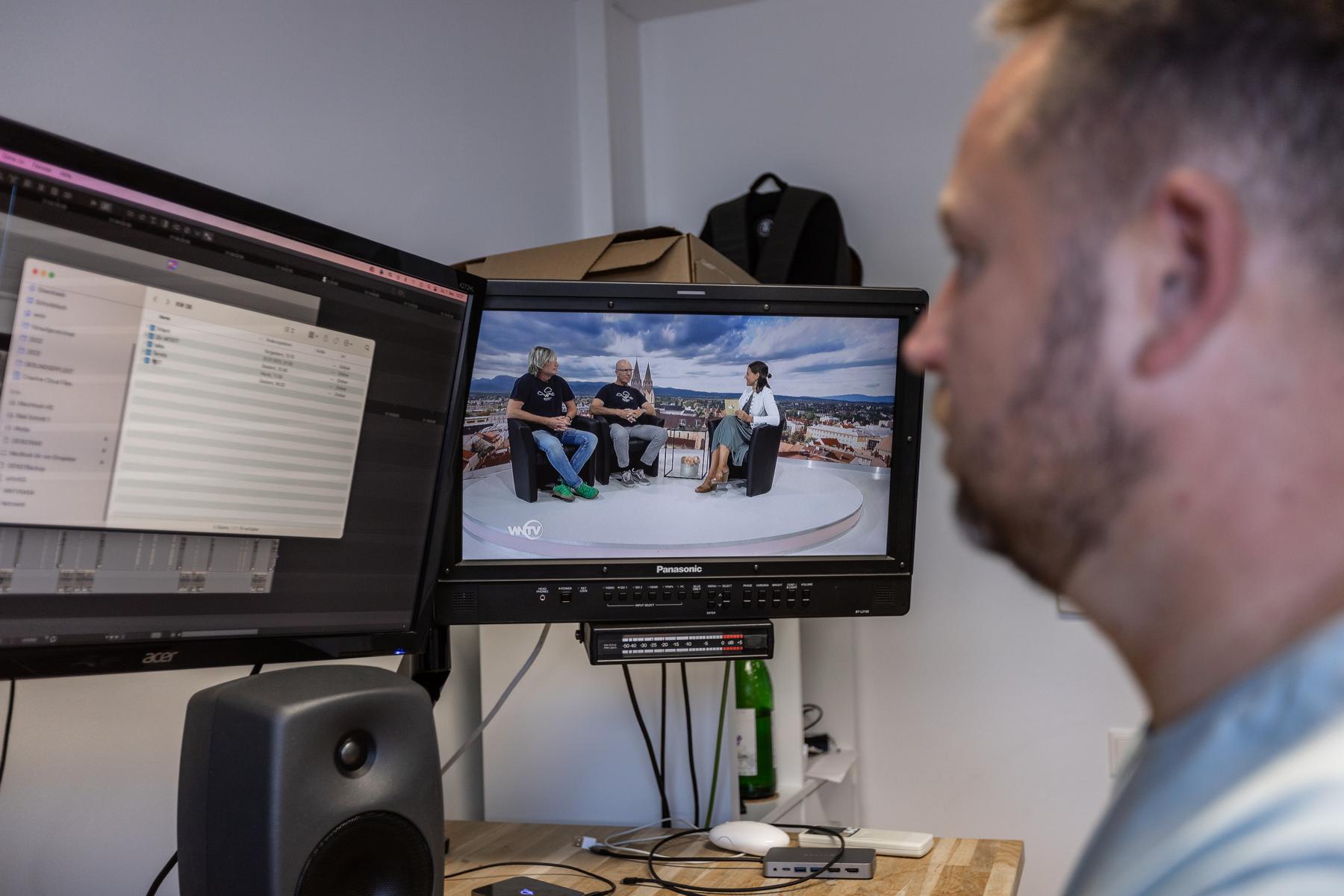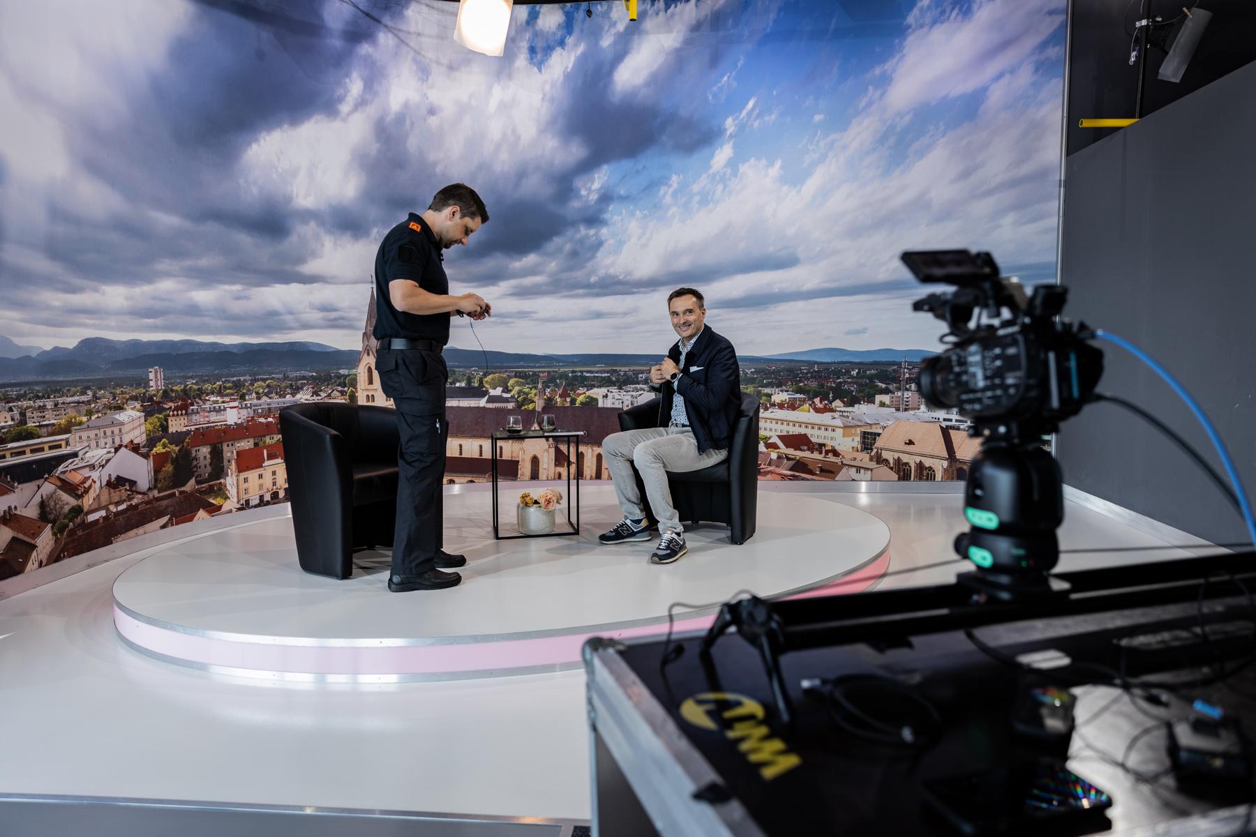 Hinter einer 6 x 4 Meter großen Glasfront bietet die teils 800 Jahre alte Wiener Neustädter Innenstadt die perfekte Kulisse für WNTV. Modernste LED – Scheinwerfer erzeugen im Studio die gleiche Leuchtkraft wie die Sonne an einem Sommertag (500.000 Lumen). Damit wird perfekt das Gegenlicht „ausgeschaltet“.