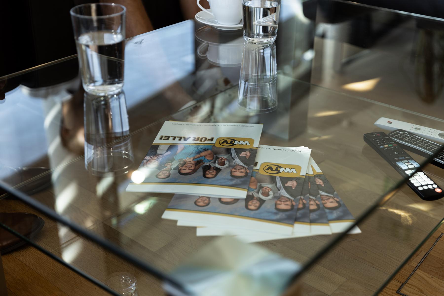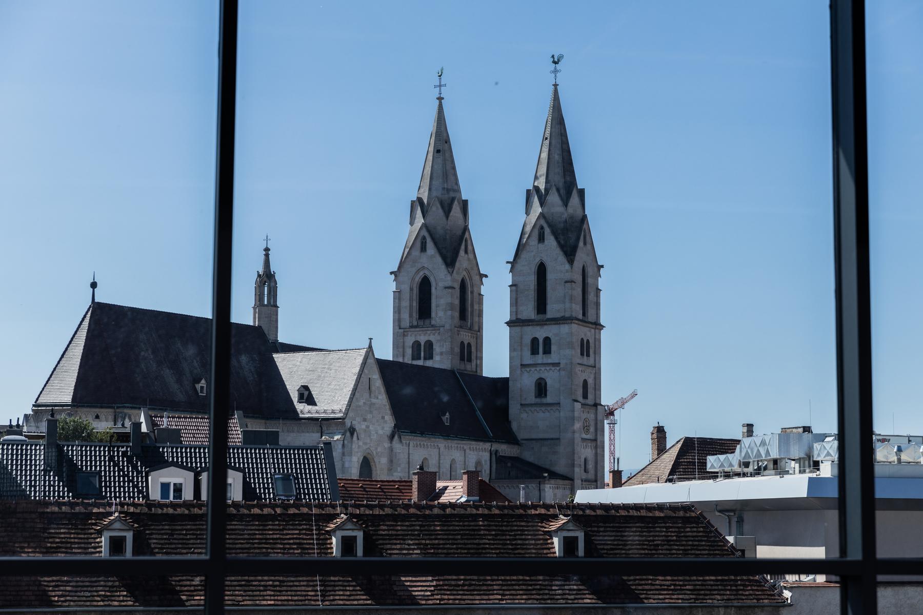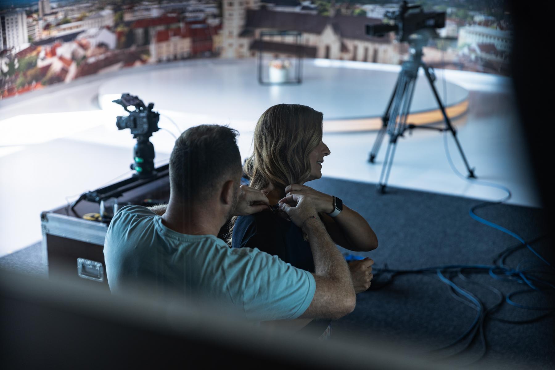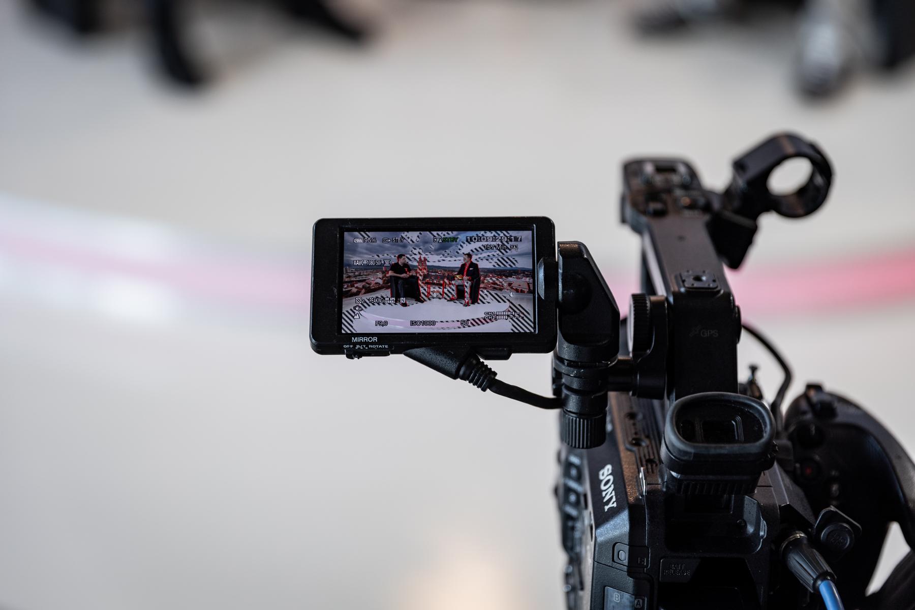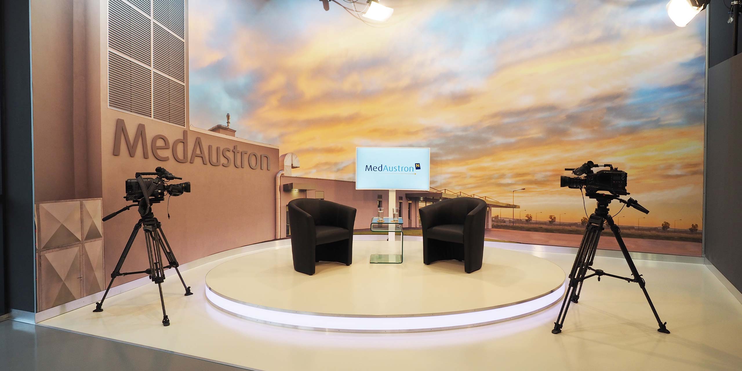Hinter einer 6 x 4 Meter großen Glasfront bietet die teils 800 Jahre alte Wiener Neustädter Innenstadt die perfekte Kulisse für WNTV. Modernste LED – Scheinwerfer erzeugen im Studio die gleiche Leuchtkraft wie die Sonne an einem Sommertag (500.000 Lumen). Damit wird perfekt das Gegenlicht „ausgeschaltet“.